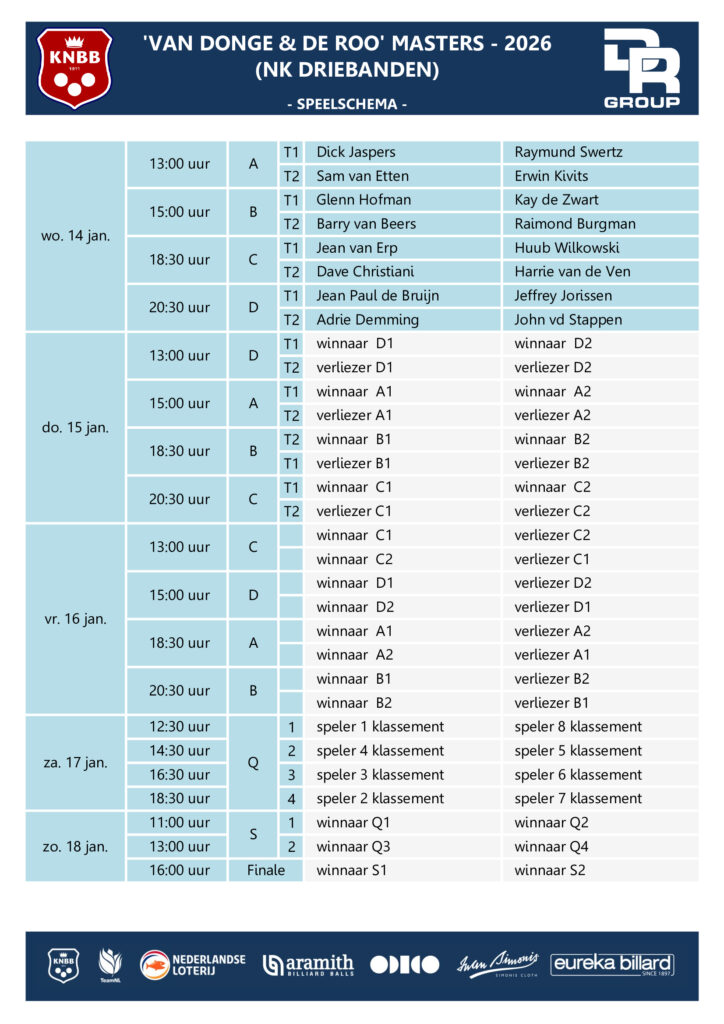 Bekijk hieronder het programma en het speelschema “van Donge & de Roo” Masters 2026.
